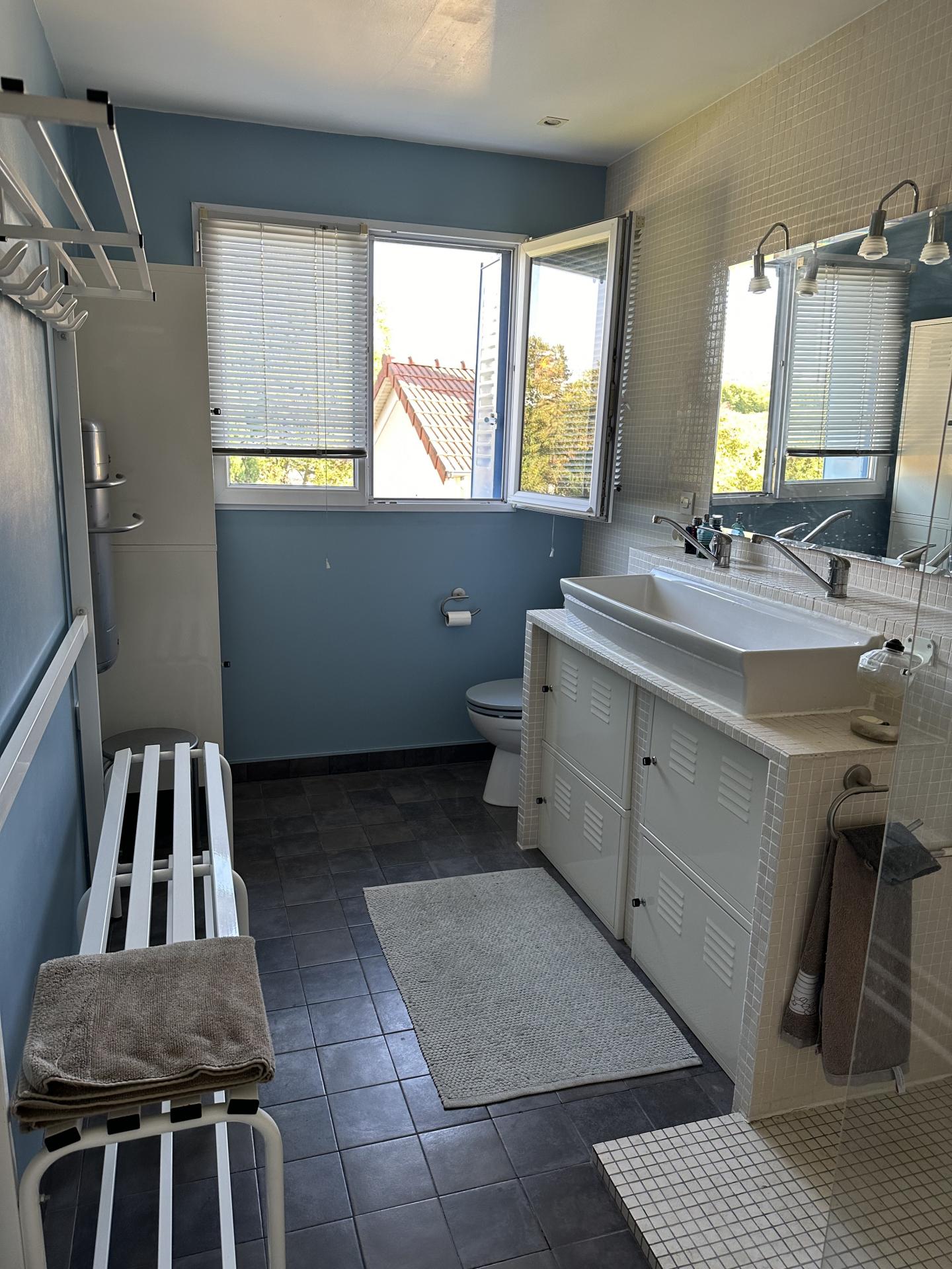 A l’étage, se trouvent 2 belles chambres avec rangements, une autre grande surface, ou vaste pallier, pouvant être aménagé en troisième chambre, salon, salle de jeu, bibliothèque …, une grande salle d’eau avec très belle douche à l’italienne et wc.