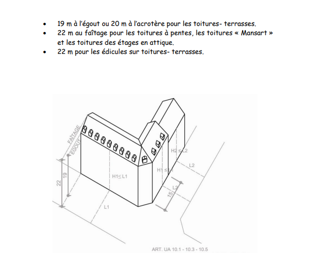 Au PLU de la Garenne Colombes : possibilité de construire un immeuble de 19 m à l'égout ou 20 à l'acrotère pour les toitures terrasses. 22 m au faitage pour les toitures à pentes, toitures Mansart et toitures des étages en attique. 22 m pour les édicules sur toitures terrasses.