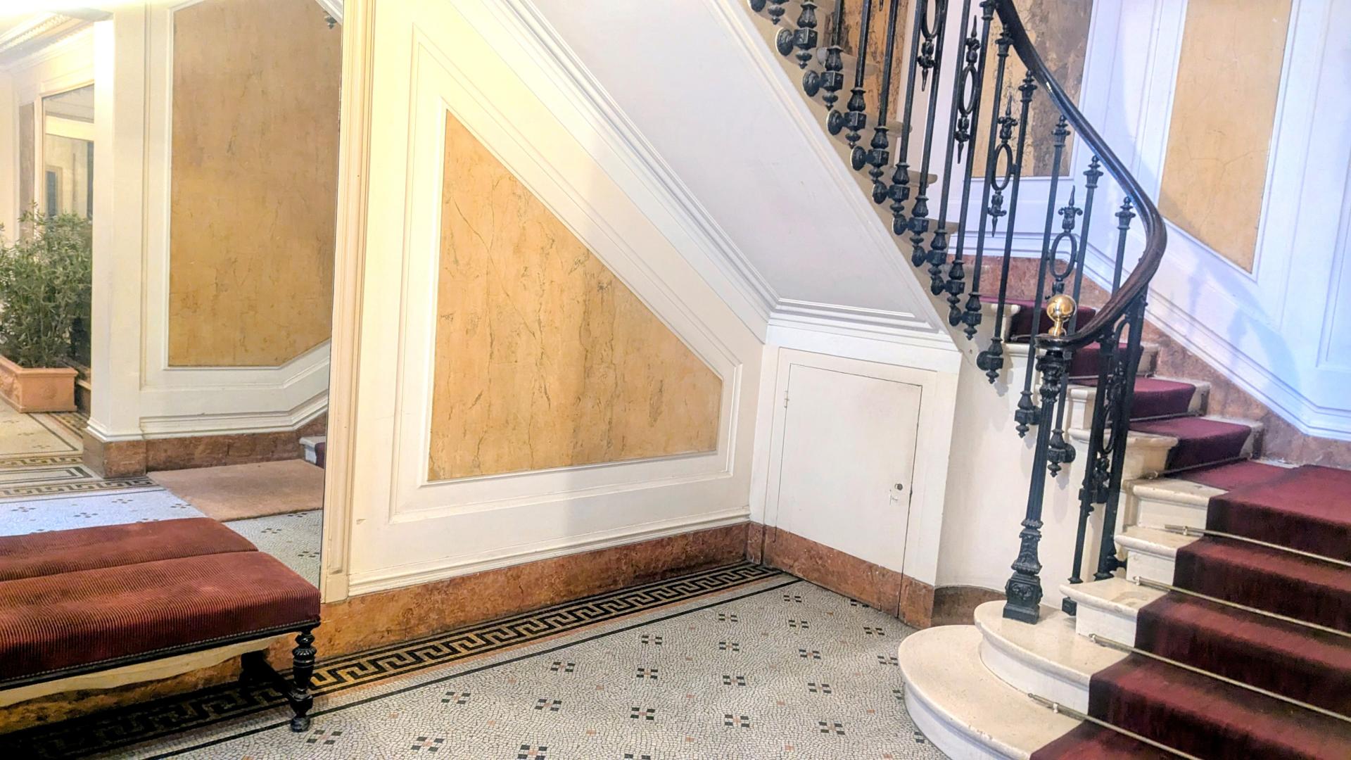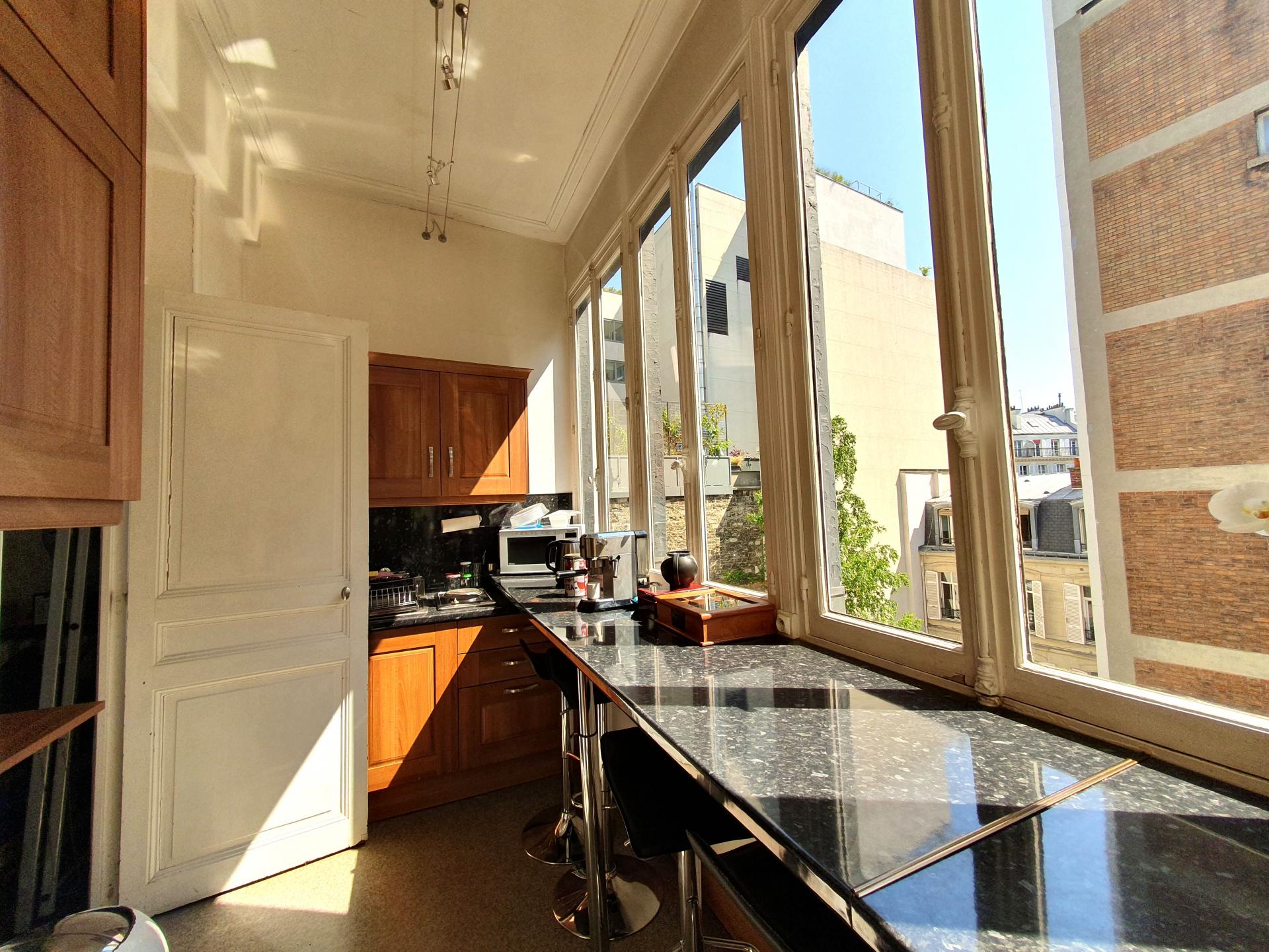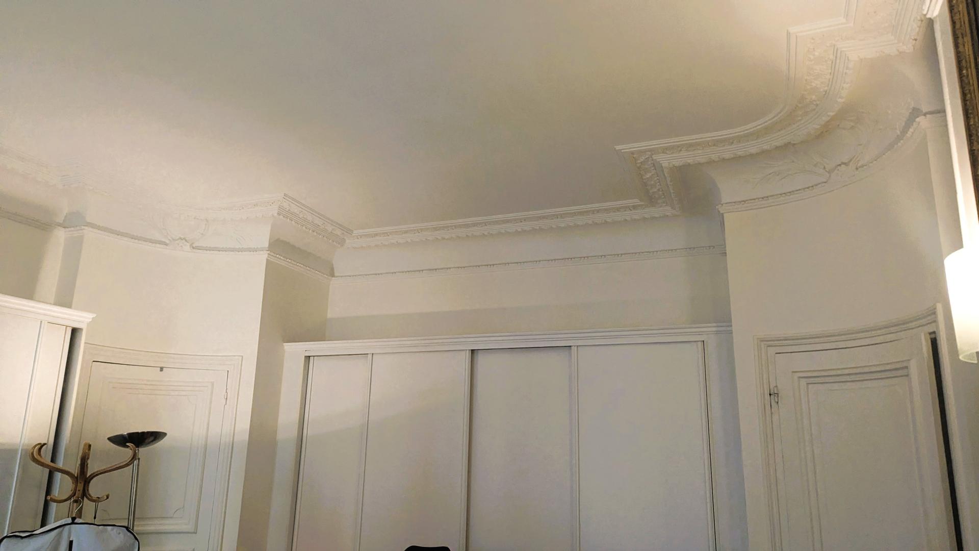 Bel haussmannien, moulures et cheminées, 3m50 de hauteur de plafond. Parquet point de Hongrie. Adresse 90 rue d’Amsterdam 75009, limite 8ème arrondissement.