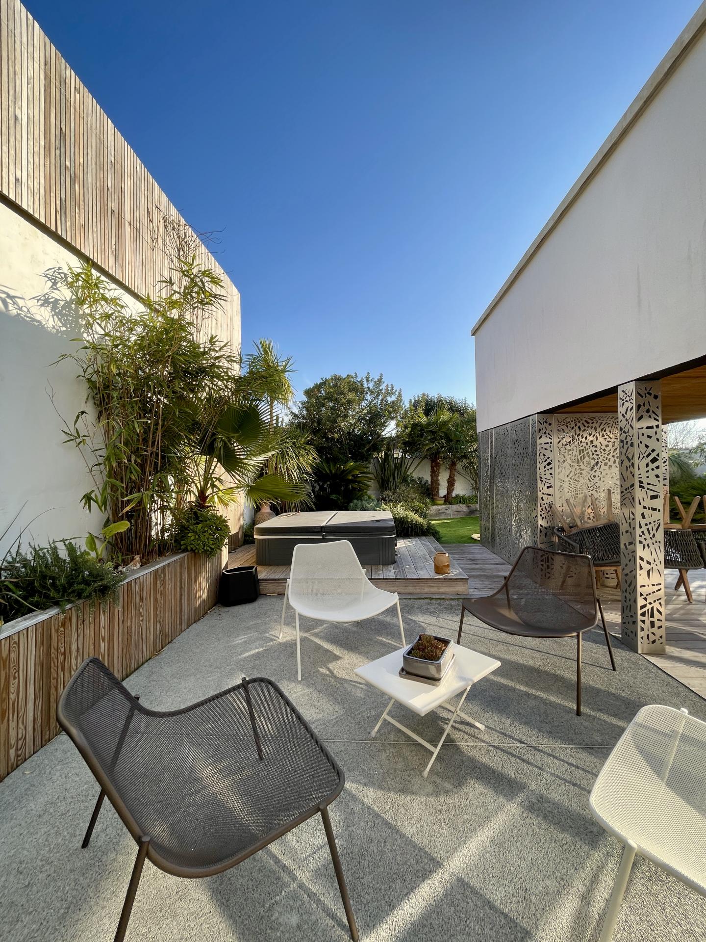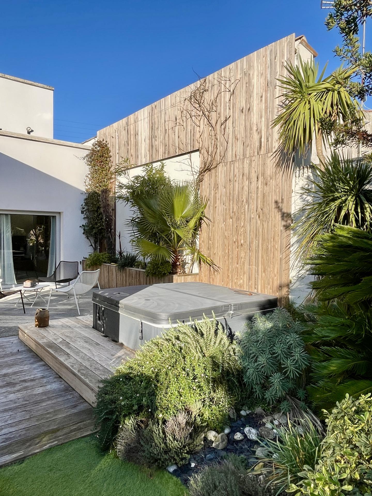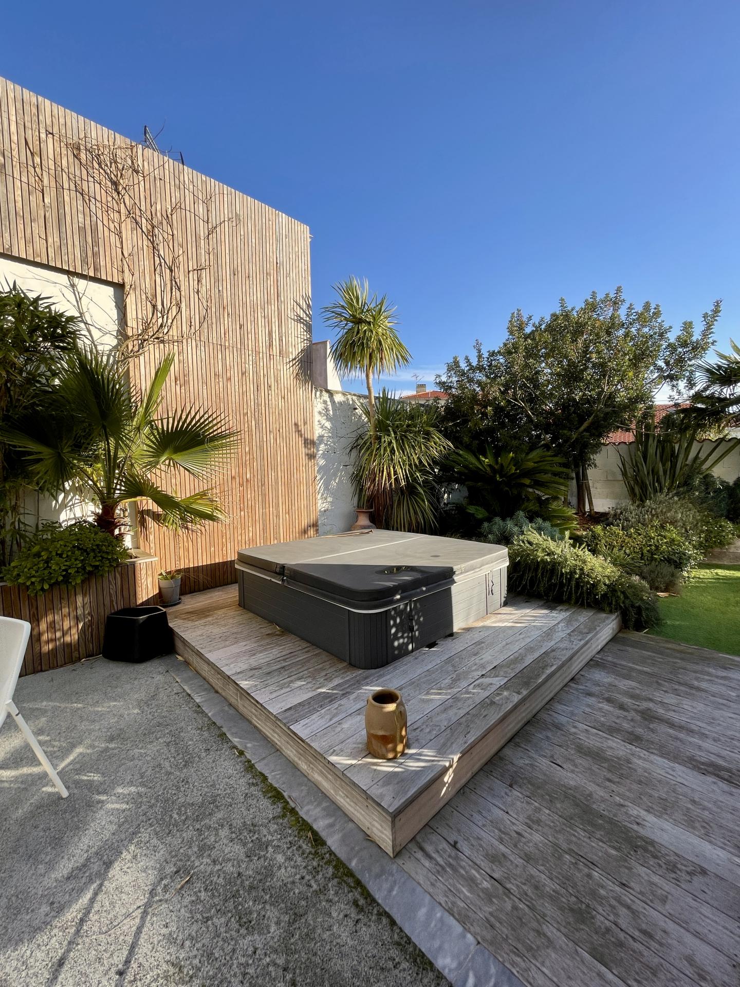 - Jardin aménagé intégrant un SPA et une cuisine extérieure entièrement équipée,