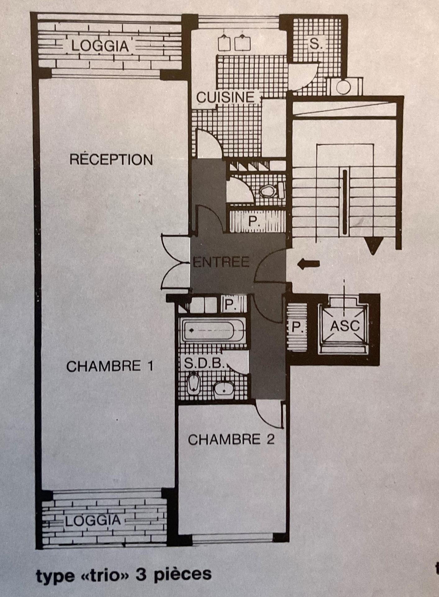 Entrée, double séjour (pouvant être facilement transformé en séjour et chambre complémentaire), chambre, cuisine avec buanderie, salle de bain, WC séparé. 2 larges loggias donnant sur des espaces calmes.