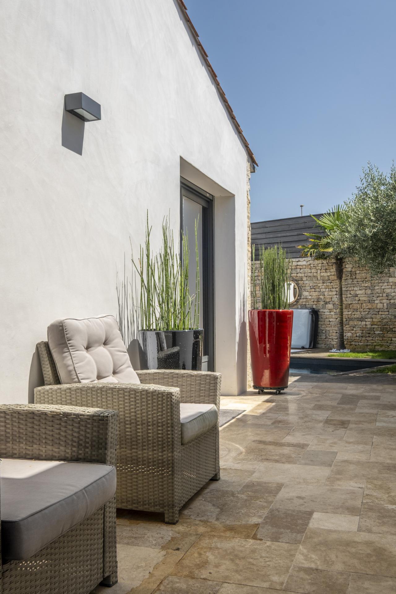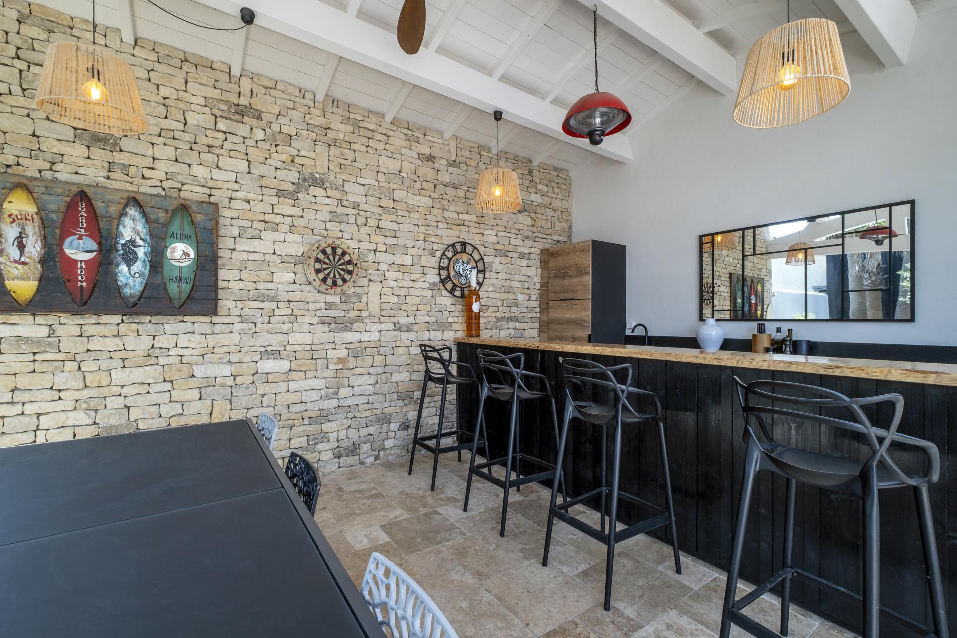 La cuisine d'été et le préau réceptif transforment chaque tablée en moment de partage mémorable - un espace pensé pour recevoir en grand, ou simplement savourer un repas dehors, à l'abri des regards et du temps. Partout, les matériaux parlent d'eux-mêmes : la pierre et le bois, travaillés avec soin, s'inscrivent avec naturel dans le paysage rhétais et s'embellissent avec le temps.