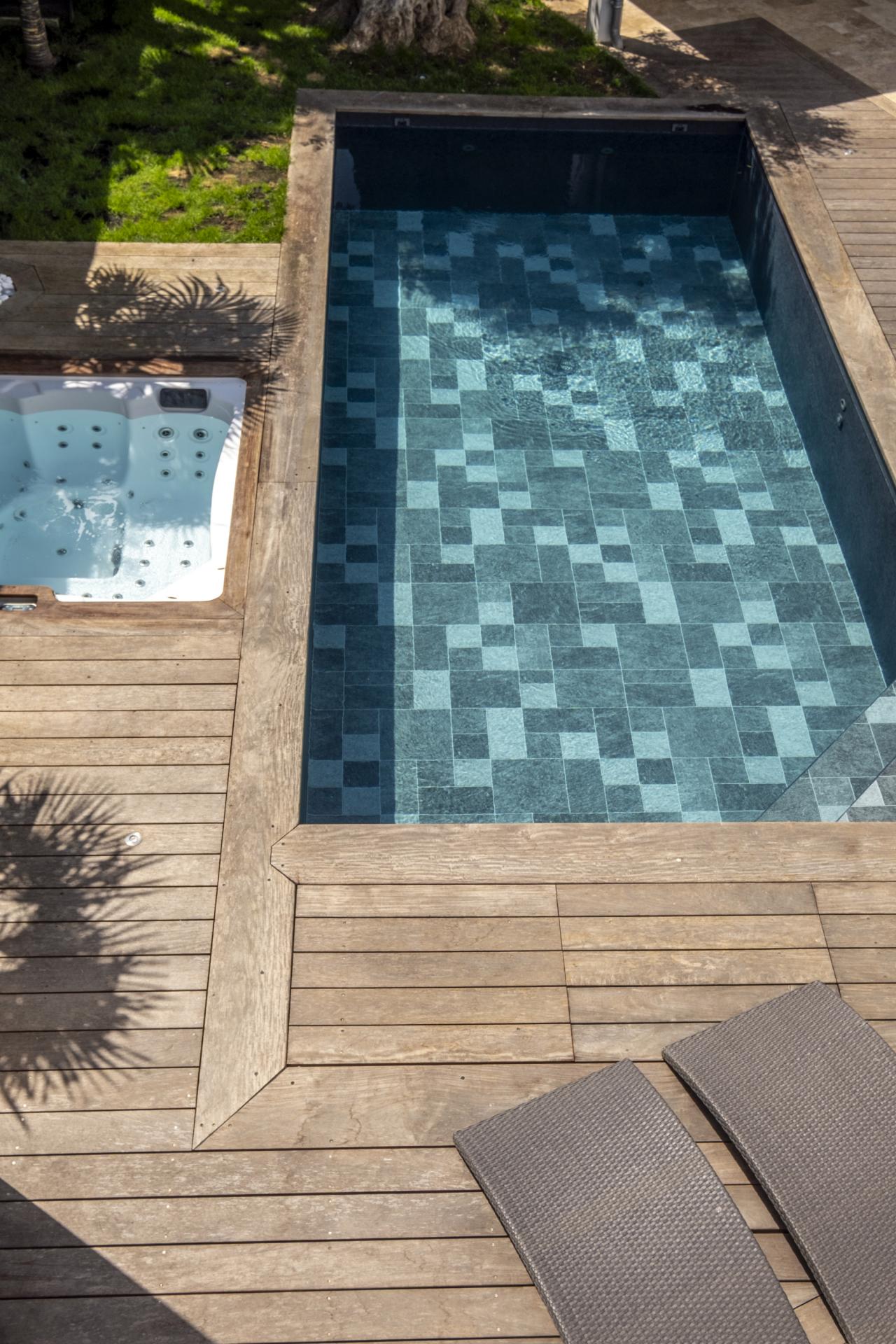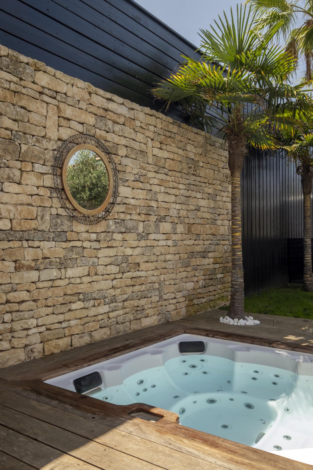 Le jardin paysager est une invitation à la pause. Ici, on ne traverse pas l'extérieur, on y vit. La piscine chauffée prolonge la saison bien au-delà de l'été rhétais, tandis que le spa offre une bulle de détente accessible à volonté.